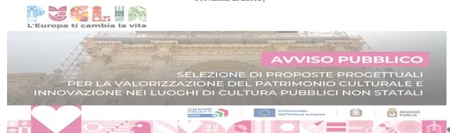 L’Amministrazione Comunale informa la cittadinanza che è in fase di predisposizione una proposta di candidatura nell’ambito del PR Puglia 2021-2027 – Priorità 8 “Welfare e Salute”, Obiettivo specifico RSO4.6, Azione 8.7 “Interventi di valorizzazione del ruolo della cultura nell’inclusione e innovazione sociale”, Sub-Azione 8.7.1 “Interventi per la valorizzazione del patrimonio culturale e innovazione nei luoghi di cultura pubblici non statali”.
